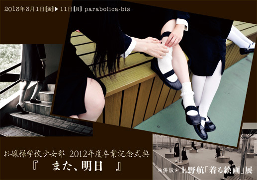 2013年3月1日[金]〜2013年3月11日[月] ■月〜金/13:00〜20:00 土日祝/12:00〜19:00 ■入場料:500円(開催中の展覧会共通) ■展覧会 会場:parabolica-bis[パラボリカ・ビス] ■東京都台東区柳橋2-18-11 ■TEL: 03-5835-1180 map お嬢様学校少女部に在学中の生徒・教員による作品、 企画主の胡子による2012年度の記録写真を展示いたします。 ★ミニ企画★ 「あなたの学校生活はどんなものでしたか?」 会期中、生徒(教員)のなどの関わった人々の記録や写真を持ち寄って展示いたします。 ★併設★ 上野航「着る絵画」展