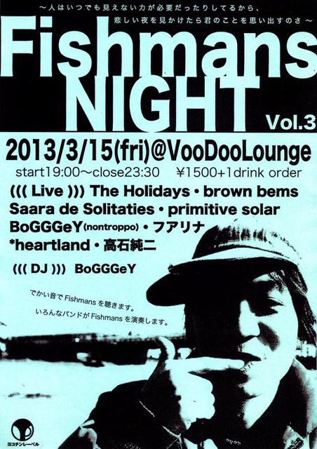 ● 佐藤伸治の命日にあたるこの日、フィッシュマンズ好きのバンドマンたちがフィッシュマンズの曲を歌う夜。 フィッシュマンズナイト・レギュラー!ダブやスカだけにとどまらないThe Holidays。 前回、圧巻のアレンジでフィッシュマンズファンを歓喜させたフアリナ。 どこまでも心地良いブルーな浮遊感が漂うbrown bems。 ハートフルな歌声で聴かせる高瀬沙亜羅率いるSaara de Solitaties さらにサイドステージでは弾き語り。 フィッシュマンズナイト福岡主催のボギー(ノントロッポ)。 毎年ホント出たがってたSOLAR野口さんが辛抱たま