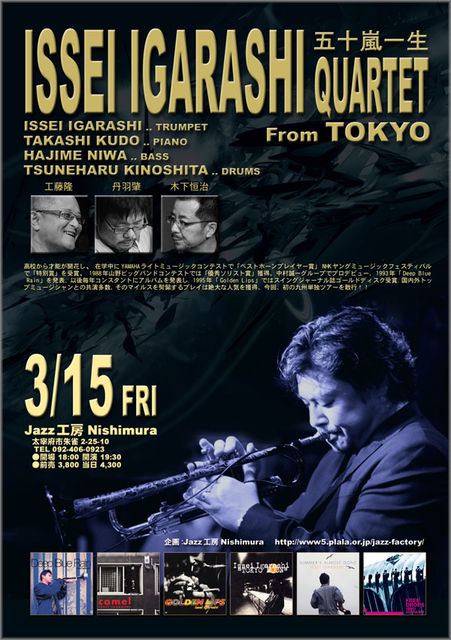 国内トップクラスのトランぺッター、五十嵐一生がやってきます。 オーディエンスもプロアマトランぺッターも、多くの方々に聴いていただければ幸甚です。 高校から才能が開花し、在学中にYAMAHAライトミュージックコンテストで「ベストホーンプレイヤー賞」、NHKヤングミュージックフェスティバルでは「特別賞」、1988年、山野ビッグバンドコンテストでは、「優秀ソリスト賞」を受賞。 中村誠一グループでプロデビュー、1993年、アルバム「DEEP BLUE」を発表、以後毎年コンスタントにアルバムを発表し、1995年、「GOLDEN LIPS」ではスイングジ