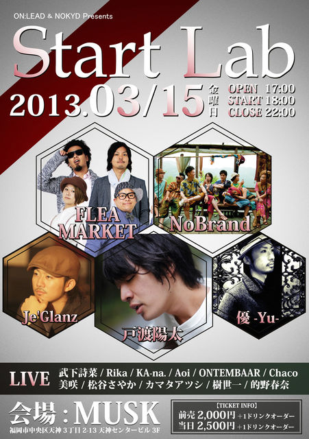 ON:LEAD&NOKYD Presents Start Lab 2013.03/15 金曜日 会場:MUSK 福岡市中央区天神3丁目2−13 天神センタービル3F OPEN 17:00/START 18:00/CLOSE 22:00 【TICKET INFO】 ◇前売 2,000円+ワンドリンクオーダー ◇当日 2,500円+ワンドリンクオーダー 【GUEST LIVE】 FLEA MARKET NoBrand 戸渡陽太 Je'Glanz 優 –Yu- 【LIVE】 武下詩菜 Rika KA-na. Aoi ONTEM BAAR Chaco 美咲 松谷さやか カマタアツシ 樹世一 的野春奈 【MC】 fro-zen from FLEA MARKET お問い合わせ NOKYD 092-716-