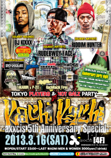 TOKYO PLAYERZ & HOT GALZ PARTY 【KachiKachi☆☆☆カチカチ☆☆☆ 】 @渋谷club axxcis[4F] 東京都渋谷区渋谷3-26-25 / TEL : 03-5485-4011 OPEN/START 23:00 〜LAST ADM:MEN & WOMEN 3000yen(1drink) ☆axxcis 5th Anniversary Special☆ 渋谷club axxcisのAnniversary partyにKachiKachiが登場!! 5周年を皆で祝いながら酔って踊って朝までカーチカーチ!!! 【GUEST SOUND】 DJ KIXXX fr MASTERPIECE SOUND 【GUEST ARTIST】 RUDEBWOY FACE RIDDIM HUNTER 【KachiKachi crew】 DJ CONTROLER(SPICY CHOCOLATE) SOH B