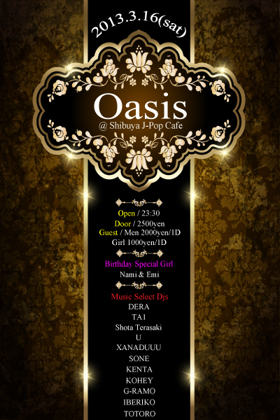 エントランスにてポンタのゲストと伝えて頂ければゲスト料金でご来場頂けます。 2013年3月16日(土) 「Oasis @ J-POP CAFE (SHIBUYA)」 渋谷を中心に様々なPary Produceを重ね、2012年夏には江ノ島Beach Raveにて2度の開催で総動員数1500人を記録するなど上昇気流である「Brack Ghost」が高級ラグジュアリー空間「J-POP CAFE SHIBUYA」にてNew Party「Oasis」を開催。 夜はプラネタリウム風に夜空が堪能でき、朝は朝日がさしのぼり、開放感ある渋谷高級Lounge「J-POP CAFE SHIBUYA」にて最先端Music Billboard Top40やEDMなどAll Mix Music