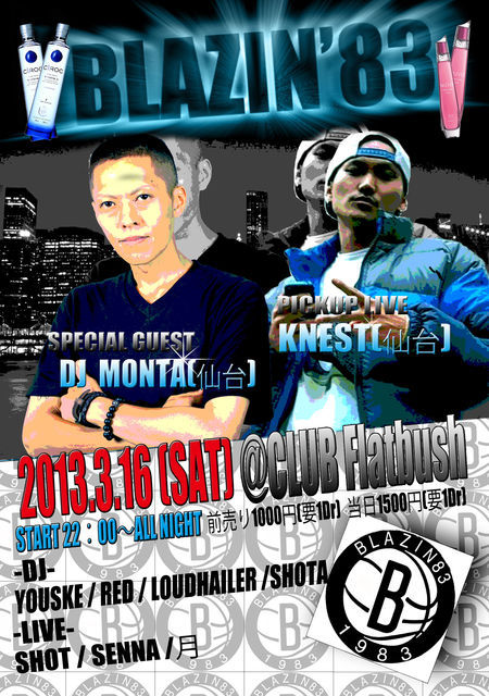 BLAZIN'83 2013.3.16 (SAT) @Club Flatbush(秋田市千秋久保田町4−5秋田駅前ビル5F ) START:22:00〜ALL NIGHT 入場料金 前売り1000円(要1Dr) 当日1500円(要1Dr) SP GUEST DJ MONTA(仙台) PICKUP LIVE KNEST(仙台) ■DJ■ YOUSKE RED LoudHailer SHOTA ■LIVE■ SHOT SENNA 月 インターネットラジオ「BLAZIN'83 RADIO」がNEW CLUB「Club Flatbush」にて、マンスリーイベントを開催。新旧HIPHOP,R&B,REGGAEを中心にDJ YOUSKEがPICK UPしたDJ陣で一晩を演出するBLACK MUSIC PARTY。 今回は