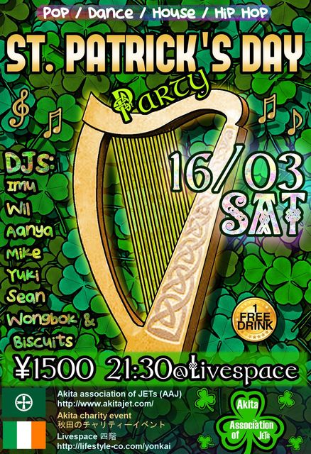 3月16日土曜日、ライブスペース四階にてAkita Association of JETs (AAJ) プレゼンツSt. Patrick's Day Dance Party を開催します! ≪詳細≫ 場所 :ライブスペース四階(秋田市) 入場料 :1500円(1 free drink) 時間 :9:30PM〜4:00AM 服装 :何か緑色のものを身につけて来てください 飲み物 :ビール、カクテル、ソフトドリンクなど DJs: Imu, Aanya, Wil, Mike, Yuki, Sean, Wong Bok & Biscuitz ジャンル: Pop, hip hop, dance, house 駐車場 :道路はさんで向かい 秋田ALTは 毎年2つの大きなパーティーを開いています