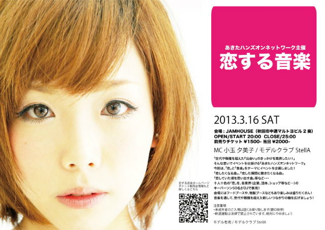 「世代や職種を超えた『出会い』のきっかけを提供したい!」 そんな思いでイベントを仕掛ける『あきたハンズオンネットワーク』。 今回は、 「恋」と「音楽」をテーマにイベントを企画しました! 「恋したくなる曲」、「恋した瞬間に聴きたくなる曲」、「恋していた頃を思い出す曲」等など・・・ 十人十色の「恋」を、 各業界(企業、団体、ショップ等など…)のキーパーソン50名がDJで表現! その他、会場にはフードブースや、物販ブースなどもあり楽しみは盛りだくさん! クラブイベントとは異なる、 誰でも気楽に参加で