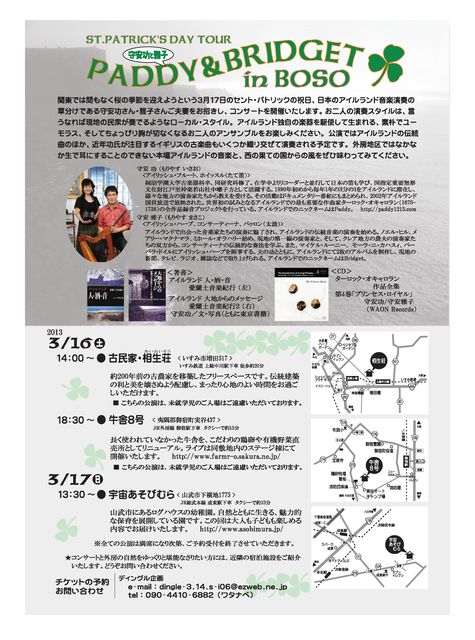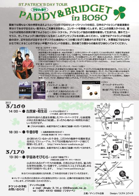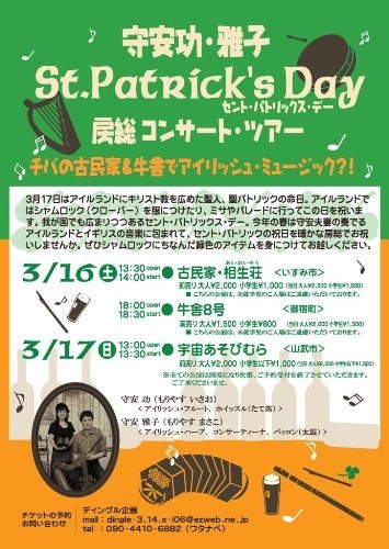 こちらのスペースでも告知させていただきます。 友人が企画したイベントを舞台裏でお手伝いしています。 内容は、日本のアイリッシュ・ミュージック演奏の草分け、守安功さん雅子さんご夫妻をお迎えし、お二人にとって初めての房総コンサートツアーをしていただくことになりました。 ♪♪♪アイリッシュ・ミュージックの守安功・雅子夫妻が房総にやってくる♪♪♪ 毎年3月17日、ヨーロッパの西の端アイルランド共和国では、国民的なカトリック教徒の祝日「セント・パトリックの日」が執り行われます。 かの国でいまだ多く