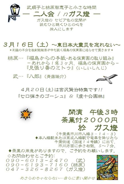 管理人様、皆様、 失礼致します。 この3月16日、二人会では、 東日本大震災支援として、朗読会を開催することにしました。 あの3月11日がまた今年もやってきます。 地震、津波での被害だけではなく、原子力発電所の事故による被害、避難生活、 大人も子供も、老若男女問わず、いまだにその見えない影を恐れながら暮らしている・・という状況のようです。 私は、 昨年、知り合いの方に読ませて頂いて心から感動した、 「あれから1年三ヶ月、福島の保育園から」という、 福島のある保育所での、子供を守るための放射能への取り組みについ