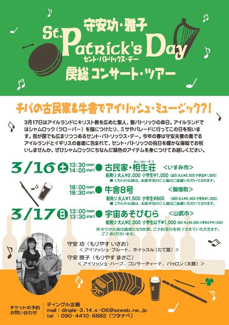 こんにちは。告知させていただきます。 友人が企画したイベントを舞台裏でお手伝いしています。 内容は、日本のアイリッシュ・ミュージック演奏の草分け、守安功さん雅子さんご夫妻をお迎えし、お二人にとって初めての房総コンサートツアーをしていただくことになりました。 ♪♪♪アイリッシュ・ミュージックの守安功・雅子夫妻が房総にやってくる♪♪♪ 毎年3月17日、ヨーロッパの西の端アイルランド共和国では、国民的なカトリック教徒の祝日「セント・パトリックの日」が執り行われます。 かの国でいまだ多くの国民に
