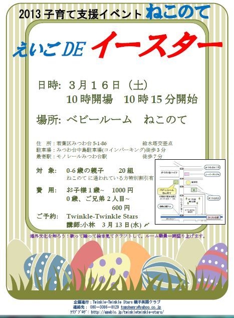 英語圏特有のイベント「イースター」 親子で英語で体験しませんか? Twinkle-Twinkle Stars親子英語クラブ と (http://ameblo.jp/twinkletwinkle-stars/) 若葉区みつわ台のベビールーム「ねこのて」様が 再びタッグを組み、春らしいイベントをします! イースター当日より2週間早い16日(土)開催! ―――――――――――――― 2012年冬の同会場でのクリスマスイベント。 たくさんのご予約・ご参加ありがとうございました! 直後に決まったこのイベント、やっとお知らせできる時期となりました^^ クリスマス直後に「ま