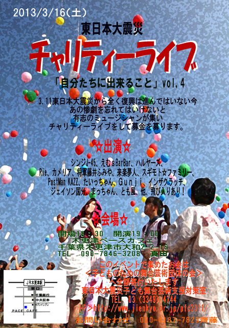 東日本大震災 チャリティーライブVol4 「自分たちにできること」 3.11の惨劇を忘れてはいけないと有志パフォーマーたちが集い チャリティーライブをして募金をつのります。 日時 2013年3月16日(土)op18:30 st19:00 場所 木更津ペースカフェ チャージ無し(募金をお願いします) 千葉県木更津市大和2-2-16 tel 090-7846-3208 真田 出演 しんじJ-45、えむsBarBar、ハルヤーズ、Rie、Gynji カメリア、将軍藤井ふみや、、来楽夢人 、マッチャン PostMan KAZZ、たいっちゃん、スギモト