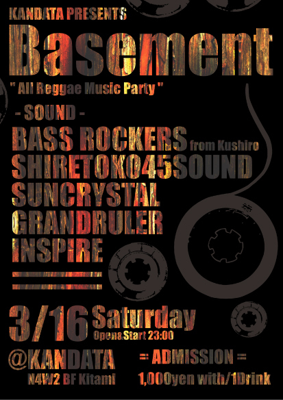 ★BASEMENT★ 2013.3.16 土曜日 OPEN/START 23:00〜 @KANDATA - Sound - ■BASSROCKERS【釧路】 ■SHIRETOKO45SOUND【羅臼】 ■SUNCRYSTAL ■GRAND RULER ■INSPIRE -Admission- 1,000yen With/1DRINK