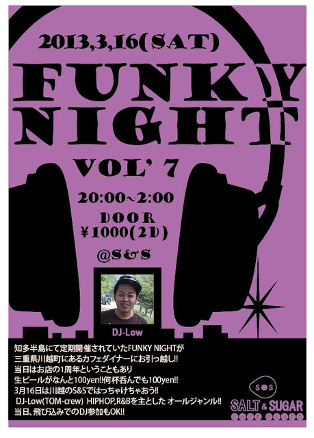 CAFE DINER S&S FUNKY NIGHT Vol,7 & S&S 1st ANNIVERSARY!!! 20:00~2:00 Door - 1000yen(2D) 何杯飲んでも生ビール100yen!!! フードもあるょ〜