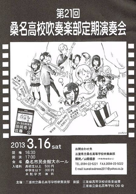 桑名高校吹奏楽部OB会 事務局長を努めさせていただいております やっきぃこと、水谷泰史(H2卒)です。 mixiでの告知がまだでしたので、遅ればせながらご案内致します。 タイトルのとおり、桑名高校吹奏楽部の第21回定期演奏会が以下の通り開催されます。 OB単独、現役生との合同ステージもありますので皆さん是非足をお運び頂けたら幸いです。 なお、演奏会の後は、吹奏楽部のOB会が開催されます。 詳しくは桑名高校吹奏楽部OB会オフィシャルHPで確認願います。 桑名高校吹奏楽部オフィシャルHP http://kuwakou-brass.com/ [日時]