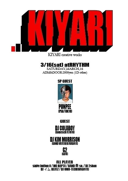 3/16『KIYARI』@伊勢RHYTHM 2000/1D別途 SPGUEST PUNPEE/DJ COLABOY/DJ KIM MORRISON/DEEJAY G2/DJ イムBEATZ/DJ 2SHAN/sinkebutton o/MC RAPTA/BAND 奏so.