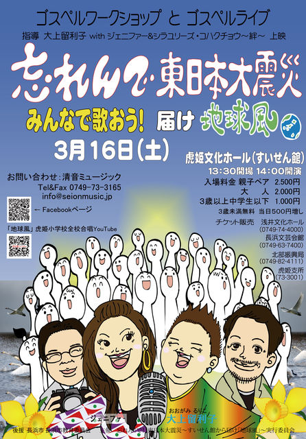 忘れんで!!東日本大震災 みんなで歌おう「地球風(ちきゅうかぜ)」! このイベントは東日本大震災に対して「遠い町で被災した方々に、何かさせていただきたい」という子供たちの暖かい心と「震災が呼び起こした日本人の様々な思いが、消えることなく未来に繋がるよう、心に残していきたい」という想いから、地元虎姫小学校児童会と平成23年度に制作した復興応援ソング「地球風」を来場者と共に大合唱し、震災の風化を止めようという企画です。 合唱指導は、ゴスペルシンガーの大御所である、大上留利子さん(代表曲・大阪で生まれた女)。また