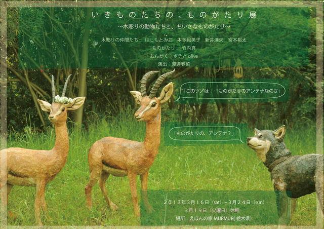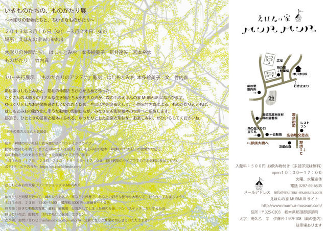 いきものたちの、ものがたり 展 木彫りの仲間たち: はしもとみお 本多絵美子 新井達矢 宮本裕太 ものがたり: 竹内真 音楽:ポチとolive 映像:渡邊春菜 日時 2013年3月16日(sat)~3月24日(sun) (19日火曜日休) 場所 えほんの家MURMUR 住所:〒325-0303 栃木県那須郡那須町大字高久乙字伊藤台1439-108(繭の里内)駐車場あり 入館料 500円お飲み物付き(未就学児は無料) 時間 10:00〜17:00 火曜、水曜定休(20日祝日は開館) 電話 0287-69-65