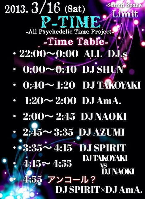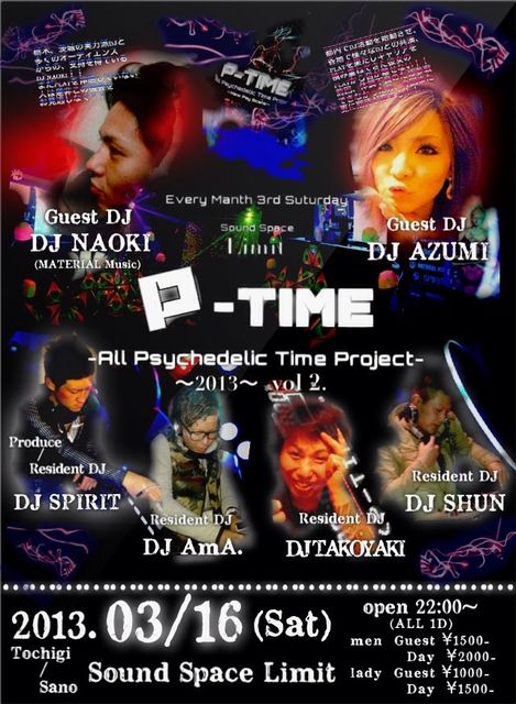 毎月第3土曜に開催してるParty!! 佐野@Sound SpaceでPsychedelic♪♪ さ〜て今週のP-TIME!!!! ・DATE 3月16日(土) ・Tochigi/Sano... ・Sound Space 《Limit》 ・Every manth 3rd Suturday... -All Psychedelic Time Project- 【P-TIME】 〜2013〜 Vol.2 先月、今年一発目から大盛況をみせたP-TIME!! PSYCHEDELICの良さが分かる、伝えるpartyといっても過言ではないかと思います・・! 今月のGuest DJには栃木、茨城の実力派DJと多くのオーディエンスの支持を得ている DJ NAOKI!! 前回、体調不良のた
