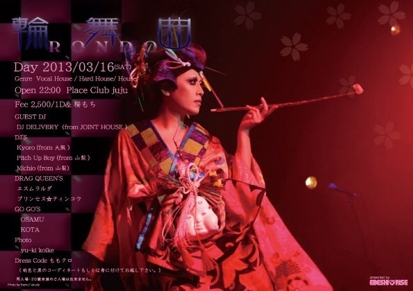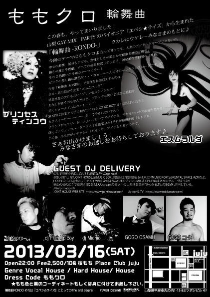この春もやってまいりました! **ももクロ 輪舞曲-rondo-** ドアの向こうには笑いの渦と感動を。。。 Open ◇ 2013/03/16(土曜日) 22:00pm Fee ◇ \2,500/1drink & 桜もち Place◇ CLUB juju 山梨県甲府市丸の内1-15-8ミツボシビル4F http://www.juju1208.com/ Genre◇ Vocal House /hard House/ House DressCode◇ 桃色と黒色コーディネイトorアイテム GUEST DJ DJ DELIVERY(from JOINT HOUSE) DJ's Kyoro(from大阪) Pitch Up Boy(from山梨) Michio(from山梨) DRAG QUEEN's エスムラルダ プリンセステ