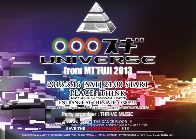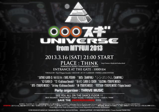 ◎◎◎スギ UNIVERSE from MT'FUJI 2013 DATE : 2013.3.16(Sat) 21:00 Start PLACE : Think (KAWAGUCHIKO YAMANASHI JAPAN) DJ SETS : ★TOKKUN (Guild/NG Sound) ★SATOKI (LOUD-X / 樹限無 /SOUL VISION) ★BATA (DAMFOOL) ★シンゴニウム (DAMFOOL) ★K2 (LOUD-X) ★T2 (Craftsman Sounds) ★KAZUMA (THRIVE MUSIC) ★RYU- (THRIVE MUSIC) ★Eel dog (Craftsman Sounds) ★M (THRIVE MUSIC) ★PSYTARO (THRIVE MUSIC / Trippin Soundz) VISUALS BY : Vaio7 (Trippin Soundz)