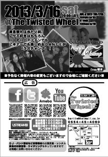 「ラガ・チャンプ」 2013/3/16(土) 20:00-LATE 満員御礼は当たり前!! レゲエ好きはもちろん HIPHOPファンや初心者でも楽しめるDANCEが ラガチャンプ!! 今回は女性シンガーも登場するので要チェック!! 熱い週末を過ごしたいしとは 来るしかない!! ■パーティー出演者等詳細はこちら http://ameblo.jp/barttw/entry-11479896525.html ■都留ツイステッドホイール mixiコミュニティ http://mixi.jp/view_community.pl?id=220942 Twitter http://twitter.com/nzwttw Blog http://ameblo.jp/barttw FACEBO