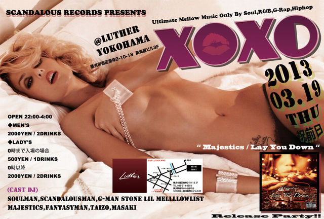 2013.03.19/Thu.(祝前日) Scandalous Records Presents.. " XOXO vol.15 " @ Lurther横浜 Ultimate Mellow Music Only By Soul,R&B,G-Rap,Hiphop 〜” Majestics / Lay You Down " Release Party.. 〜 Open 22:00-4:00 ◆Men's 2000Yen / 2Drinks ◆Lady's 0時まで入場の場合〜500Yen / 1Drinks 0時以降〜2000Yen / 2Drinks @Luther(ルーサー) 横浜市西区南幸2-10-18 3F Tel:045-314-8993 横浜駅西口から徒歩5分 300円均一香港厨房のビルの3F [Cast Dj] Soulman Scandalousman G-Man Stone