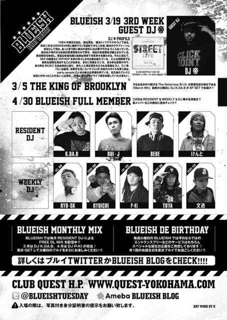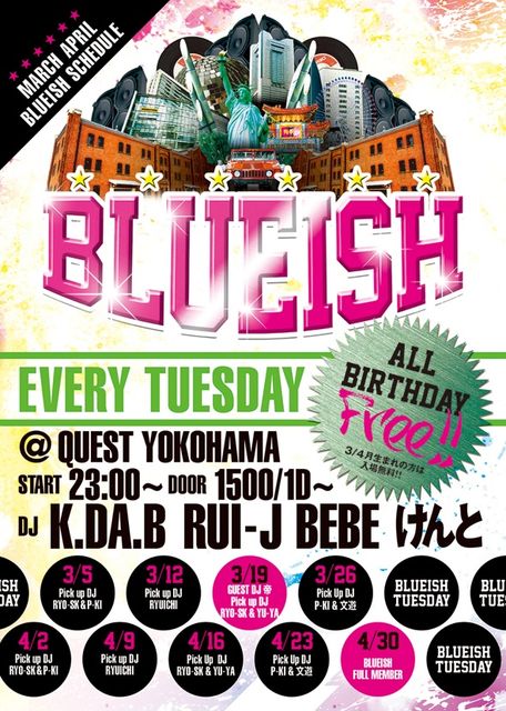管理人様、告知失礼致します。 ★このPARTYでのゲスト枠ご希望の方は、当日入り口にて「べべのゲストで来た」と一言だけお伝えいただければ何名様でも、1500/1D で入場可能となりますのでお気軽にご活用下さい★ また、何かご質問などがありましたら直接メッセにて承りますのでお気軽にどうぞ☆ BLUEISH一同皆様のお越しをお待ちしております☆ 〜BLUEISH INFO〜 毎週火曜日のBLUEISHでは「平日のPARTY」を作り上げるため、 新譜HIP-HOP、R&B、REGGAE、TOP40を中心に様々なPARTY TUNEをご用意して 皆様のご来場をお