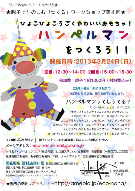 ★親子で楽しむ「つくる」ワークショップ第4回★ 「ひょこひょこ動くかわいいおもちゃ!ハンペルマンを作ろう!」 ハンペルマンをご存知ですか? 『ハンペルマン』とは、ドイツ語で『手足を上下に動かす人形』という意味で、その名の通り、紐を引くと手足がぴょこんっと上に上がるおもちゃです。仕掛けはシンプル。その素朴でかわいい動きを見たくて、何度もひっぱりたくなってしまう!そんな愉快なおもちゃを親子でつくってみませんか?かべかけとして、お部屋を楽しく演出する役目もあります。 【開催日時】2013年3月2