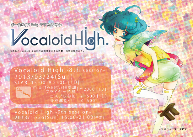 初音ミクを代表とする歌声合成ソフトウェア “VOCALOID” 毎日のように新曲が公開され、今や10万曲を越えるとも言われる"楽曲" 楽曲のPVやMMDなど、ボーカロイドの世界を演出する"映像" 二次創作を中心に、既存のキャラクターでは最大級の種類となる"衣装" 更に進化したVOCALOID3の登場、増えるキャラクター達 今やマスコミでも話題沸騰のVOCALOID! 2013もさらに勢いを増すボーカロイド!!! そんな魅力いっぱいのボーカロイドを愛し過ぎちゃった人たちが 集まって"表現"するクラブイベント! 【Vocaloid High 】 意味:Vocaloid成