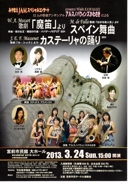 突然の書き込み失礼いたします。 『アルスノバウインズかわさき』と申します。 この度、宮前市民サークルの祭典『みやまえJAM』にて私共「アルスノバウインズかわさき」がスペシャルコンサートをさせて頂くことになりました。 この場をお借りしご案内させていただきます。 ■□ みやまえJAM2013 スペシャルコンサート □■ 日時 : 2013年3月24日(日) PM3:00 開演 (2:30 開場) 場所 : 宮前市民館 大ホール 入場料 :