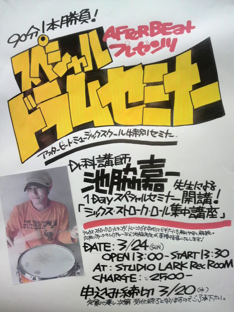 アフタービートミュージックスクール特別セミナーを開催する事になりました 第1弾はドラム科講師、池脇先生による『シックスストロークロール集中講座』でございます 3/24(日)OPEN13:00/START13:30 CHARGE \2500 持ち物→スティック、練習パッド(無くてもご参加頂けます) ビギナーさんにも解り易く解説しますよー 練習方法やコツ、応用パターンの紹介もありますので、youtubeをご覧頂いている方も そうでない方も楽しんで頂けるのではないかと 質疑応答やデモ演奏ももちろんありますので