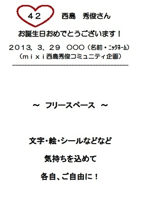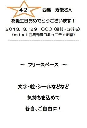 西島さん、お誕生日おめでとうございます! とうとうお誕生日となりました(*^^*) ご参加下さった皆々様、ありがとうございましたm(_ _)m 全てのカードが無事に西島さんに届きますように!(3/29時点) 一昨年、昨年と行ったバースデーカード企画!今年も皆さんで西島さんのお誕生日をお祝いしませんか?せっかく2年続いたので、今年は出さないというのは寂しいな〜と…誰か言い出さないかな〜と…思いまして、また勝手に企画しましたm(_ _)m(2/19時点) 当初の目標参加人数100人を越えましたのでイ