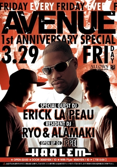 管理人様告知失礼致します。 今夜は普段BX CAFEで行われている "AVENUE"が1周年です。 特別に、2F(PUNCH OUT)と3Fを入れ替えて盛大に開催します!! そして1周年を祝うSPECIAL GUESTには ERICK LA PEAU from NYを招いてまさにNYさながらの一夜をお贈りします。 こんな贅沢な一晩を是非お見逃しなく! ★★★★★★★★★★★★★★★★★★★★★★★★★★★★★★★ ■■■■■■■■■■■■料金設定■■■■■■■■■■■■■■■ 0時まで1000/1D 1時まで1500/1D 1時以降2000/1D になります。 ★★★★★