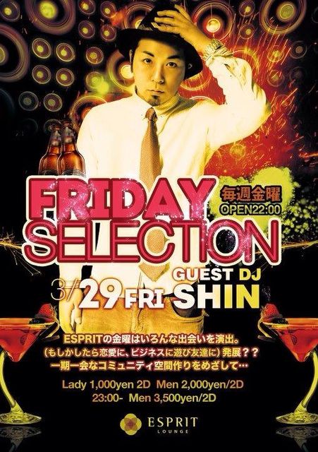 管理人様、告知、失礼します! 3/29(金) 『FRIDAY SELECTION』@六本木 ESPRIT LOUNGE ゲスト料金 簡単入場方法 ★★★★★★★★★★★★★★★★★★★★★★★★★★ 入口にて「イチノセのゲストでフレア」と言って頂ければ、 女性1000円/3drink付き!! 男性も2500円/2drink付きでご入場が可能です☆ ★★★★★★★★★★★★★★★★★★★★★★★★★★ ☆イベント詳細☆ 毎週金曜開催! 『FRIDAY SELECTION』 毎週大好評、満員御礼!! 六本木に超豪華空間が誕生!超ラグジュアリー空間☆