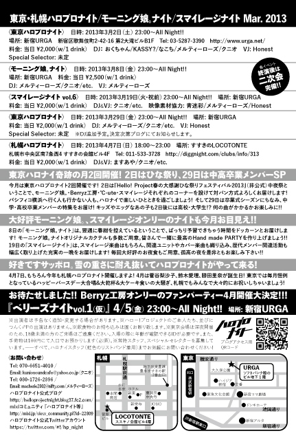 お世話になっております。 今回はお花見直前スペシャルな日程での開催です! “東京ハロプロナイト” 〜旅立ちの春が来た、卒業・進学おめでとうスペシャル〜 日時:2013年3月29日(金) 23:00〜All Night!! 会場:新宿URGA 03-5287-3390 住所:新宿区歌舞伎町2-42-16第二大滝ビルB1 http://www.urga.net/ 料金:当日2000円(1ドリンク付) DJ:おくちゃん/メルティーローズ/クニオ VJ:Honest Special Selectors:未定 ☆出演者は予告なく追加・変更する場合があります。 【3月リピート開催、桜の花は咲くか!?