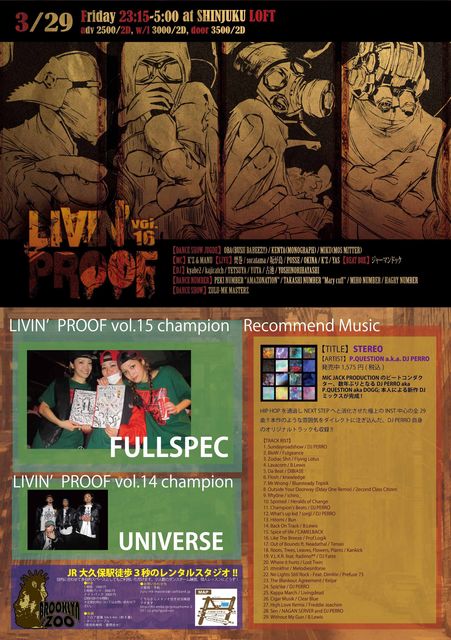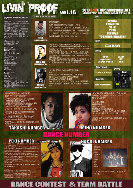 【LIVIN'PROOF DANCE CONTEST & TEAM BATTLE】 SHOW CASEより、JUDGEがチームを選抜。 (1部2部より、点数の高かった4TEAMが、バトルに進む) 選抜されたチームでダンスバトルのトーナメント戦を行い、 最後まで勝ち残ったチームに優勝賞金50000円★★を贈呈させていただきます! (バトルルール:DJがランダムで流す曲に合わせTEAM対TEAMで戦います。 1バトル5分間のバトルを行います。 1ムーブ[ルーティーン含む]最大30秒。) ◆日時 2013.3.29 fri(23:15-5:00) ◆場所 新宿LOFT ◆参加費: ”エントリーノルマ