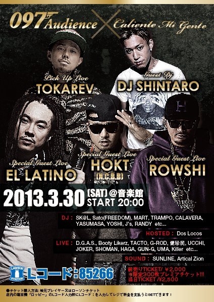 さあ!!いよいよ明日土曜日です!! 皆さん準備していますか? 大分県のBIG PARTY!! 097 Audience × Caliente Mi Gente!!! 明日3月30日の第5土曜日!!! 場所は大分@音楽館20:00〜スタートです 大分初来県は NCBBから HOKT!! http://www.youtube.com/watch?v=P2qaSK6Fhys 名古屋.052から EL LATINO!! http://www.youtube.com/watch?v=EOziWOs-BHs 九州.福岡からは ROWSHI!! http://www.youtube.com/watch?v=hKAqUpALBEw TAKAREV!! http://www.youtube.com/watch?v=YRT7NbougIY そしてGUEST DJ は2012 RED BULL関東チャンピン