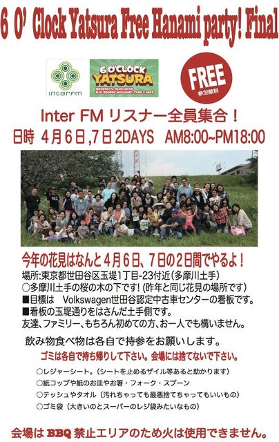 6 O'Clock YATSURA Free Hanami Party Final 今年もこの季節がやってきました!花見〜〜〜〜今回は4月6日、7日の2日間でやります。 日曜日に来れなかった人も今年は大丈夫だよ!皆さんに声をかけて参加して下さい。 会場は毎年花見をやっている尾山台の多摩川河川敷です。 飲まない人は駐車場も増えたので車でもだいじょうぶです。シェアーして下さい。 場所:東京都世田谷区玉堤1丁目-23付近 毎年お花見をやっている場所です!! ■目標は Volkswagen世田谷認定中古車センターの看板です。 ■看板の玉堤通りをはさんだ多摩川河川