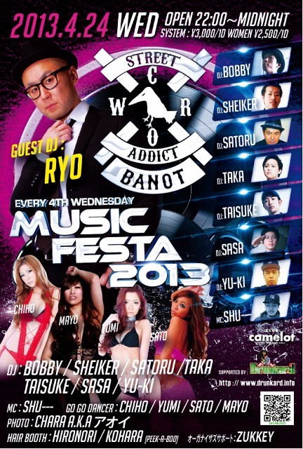 管理人様、告知失礼致します。 4月24日水曜日、22時オープン。 ☆毎月第4水曜日開催中☆ 「MUSIC FESTA × BANOT」@渋谷 CAMELOT♪ ※GUEST DJ:RYO ※イベント規模:600人 ※BANOT: http://banot1.com/ ★★★★★★★★★★★★★★★★★★★★★★★★★ エントランスにてご入場の際、 『ドランカードのゲストでアフロ』 と言っていただけたら、 ★ゲスト料金★ 男性:2000円/1ドリンク 女性:1500円/1ドリンク にてご入場する事が出来ます!! ※また個別にゲスト希望の方は、 タイトルに「