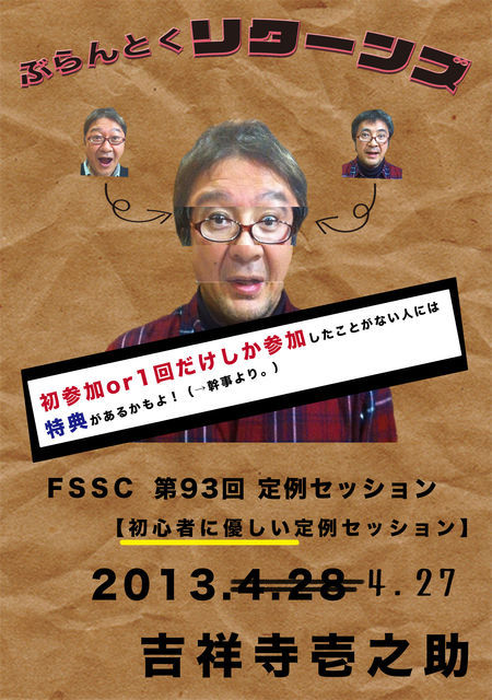 【ぶらんとくリターンズ:初心者に優しい定例セッション】 みんなで楽しく音楽セッションやりましょう。 フリーソウルなんて小難しく名乗ってますが、 要は自分のやりたい演奏なら何でもリクエストOK! あなたがソウルと思えば大丈夫! 音楽仲間ふえるよ! さてさて春です!改まって新年度、フレッシュマンの季節! 今回は「今までFSSCに馴染みの無かった人たち集まれ!」 の一大キャンペーン企画です。特にまだ一回だけしか来てない 初参加してみたい!って人は今回チャンス!特典ありかも! 場所はひさしぶりの吉祥寺!ス