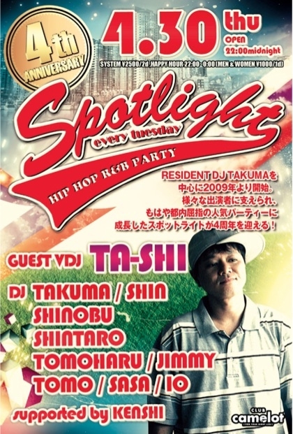 告知失礼します。 ■□■□■□■□■□■□■□■ camelot☆簡単ゲスト入場↓↓ 『シンのゲストでスポットライト』 と受付にて言って頂くと何名様でもゲスト料金で入場できます。 [男性] 1000円/1Drink [女性] 1000円/2Drinks ■□■□■□■□■□■□■□■ 4/30 (火) 22:00-5:00 -HipHop, R&B Party- 『SPOTLIGHT 4th Anniversary』 @渋谷 Camelot 火曜camelotの大人気PARTY『Spotlight』 毎回400人規模で盛り上がっているこのParty!!!!! 今回はGW期間&イベントの4周年ってことで800人規模で大