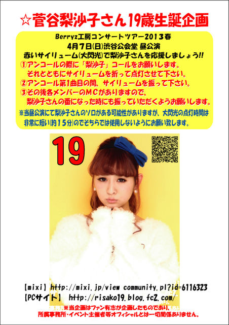 当日企画を行なうにはやらなければならないことがたくさんあります。そこでお手伝いしていただける方を募集します。 当日1日の流れを私の日記に書いていますのでそちらをご覧下さい。 「菅谷梨沙子さん19歳生誕企画 当日スタッフ募集」 【http://mixi.jp/view_diary.pl?id=1898153391&owner_id=45649380】