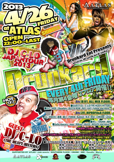 管理人様、告知失礼致します。 毎月第4金曜日にATLAS@渋谷にて開催している特典満載の大注目PARTY"Drunkard"!!今回はNew Yorkを中心とする各シーンにおいてのスペシャリストHIP HOP集団「THE HEAVY HITTERS」のDJであり、アメリカのみならず世界のヒップホップ・ファンに大きな影響を与えるニューヨークの人気ラジオ局HOT97のDJを勤める"DJ C-LO"が来日!!"DJ C-LO JAPANTOUR 2013 "として盛大に開催致します!! その他特典も満載!!大学生の方は学生証を提示で1ショットサービス!!女性3名様以上の同時入場の場合先着10組様にシャンパンミニボトルサ