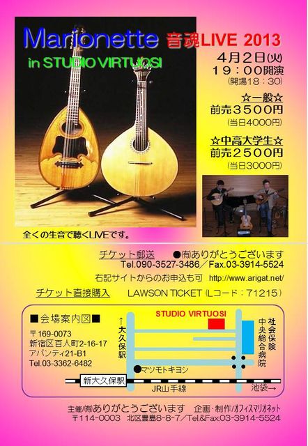 ¥Þ¥ê¥ª¥Í¥Ã¥È¤Î±éÁÕ¤ò °ìÀڤβ»¶Áµ¡´ï¤ò»È¤ï¤Ê¤¤À¸±éÁդdzڤ·¤à Ž¢²»º²¥é¥¤¥ÖŽ£¤Îµîǯ¤Ë°ú¤Â³¤¯³«ºÅ¤¬·è¤Þ¤ê¤Þ¤·¤¿¡£ »³¼êÀþ¿·Âçµ×Êݱض᤯¤Î½»Â𳹤ˤ¢¤ë Äê°÷80̾¤ÎSTUDIO VIRTUOSI¤¬²ñ¾ì¤Ç¤¹¡£ ¤´ÅÔ¹ç¤Î¤Ä¤¯Êý¤Ï¤¼¤Ò¤´Íè¾ì¤¯¤À¤µ¤¤¡£ ¢£Æü»þ¡¡2013ǯ4·î2Æü(²Ð)¡¡19»þ³«±é¡¡¢¨³«¾ì18»þȾ ¢£³«¾ì¡¡STUDIO VIRTUOSI ¡¡(¿·½É¶èÉ´¿ÍÄ®2-16-17 ¥¢¥Ñ¥ó¥Æ¥£21-B1) ¢£ÎÁ¶â¡¡Á°Çä/°ìÈÌ3,500±ß¡¢Ãæ¹âÂç³ØÀ¸2,500±ß ¡¡¡¡¡¡¡¡(ÅöÆü¤Ï³Æ500±ßUP) ¡ý¥Á¥±¥Ã¥È¼è°·¤¤ ¡¡¡ùľÀÜ¹ØÆþ/LAWSON TICKET:L¥³¡¼¥É£·£±£²£°£µ ¡¡¡ù¥Á¥±¥Ã