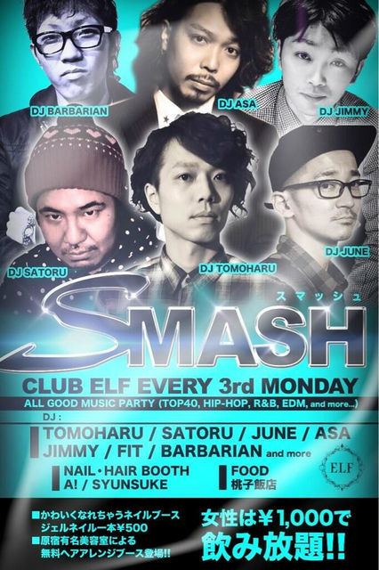 4/15 (月)『SMASH』@渋谷ELF 22時オープン ☆☆☆☆☆☆☆☆☆☆☆☆☆ エントランスで 【サトルのゲストのサト】 とお伝えいただければ [ゲスト料金] MEN \1000/0D WOMEN \1000/FREE DRINK でご入場できます!! ☆☆☆☆☆☆☆☆☆☆☆☆☆ 2012年5月渋谷CLUB ELFで始まった NEW PARTY!!「SMASH」 『SMASH』というタイトルのままに、遊びに来たお客様にぶっ壊れる程に楽しんでほしい。 純粋に思いっきり楽しめる、最高に楽しいPARTYを演出していきます! 平日月曜日の夜を実力派DJ陣が最新曲〜懐かしの