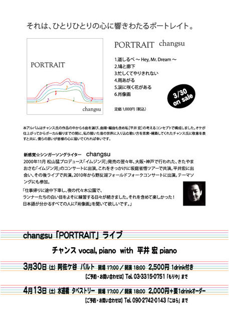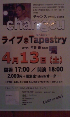 野反湖フィールドフォークコンサートでお馴染みのチャンス氏が、 初のアルバム「PORTRAIT」をリリース(3/30発売)。 発表記念ライブをタペストリーで行います。 4/13(土)Changsu キム・チャンスLIVE@Tapestry チャンス vocal, piano with 平井宏 piano [時間] 開場17:00/開演18:00 [料金] 2,000円+要ドリンクオーダー ご予約・お問い合わせは、 メール又はTel.090-2742-0143(こはら)まで。 (人数に制限がございますので、お早めにご連絡ください) Imported Beer Cafe TAPESTRY 東京都千代田区三崎町2−2−1