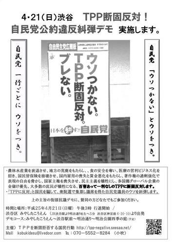 自民党公約違反糾弾デモ 実施します。 農林水産業を衰退させ、 地方の荒廃をもたらし、、 食の安全を奪い、 医療の営利ビジネス化を招き、 国民皆保険を崩壊させ、 国内雇用の喪失と賃金悪化をもたらし、 著作権の過剰強化で表現の自由を脅かし、 国家主権を喪失させ、 民主主義を犠牲にし、 多国籍グローバル企業の金儲けを最優先し、 大多数の庶民が犠牲になる、 百害あって一利なしのTPPに断固反対します。 併せ、「TPPに反対」と国民を騙し、衆院選で集票し議席を得た 自民党議員の大ウソを糾弾します。 上の