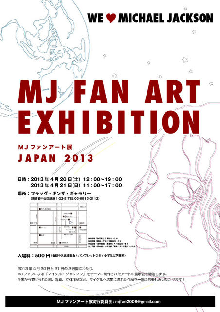 2013年4月20日-21日、東京都内のギャラリーにて「MJファンアート展」を開催します! 2009年12月に開催された第一回目の展示会では、全国のMJファンによる「マイケル・ジャクソン」をテーマに制作されたイラスト、油絵、デッサン、版画、写真、映像、立体作品など、86点を展示しました。 作品はすべて記念パンフレットに掲載し、イベント後日、米国のマイケルの子供たち(Prince, Paris, Blanket)宛に送付しました。 4年ぶりとなる今回も全ての出展作品が出揃いまして、開催まであと1週間です! 今回も全ての作品をパンフレット紙面で見ること