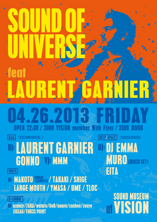 EMMAさん出演イベントです! \3000 VISION members, with Flyer \3500 DOOR ですが… 2,000円/1Dのディスカウント取れます! ご希望の方は代表の方のフルネーム(カタカナ)と お連れ様の人数をメッセージください! 以下、イベント詳細です。 キング・オブ・テクノがVISION2013黄金週間の幕を開ける この夜から、VISIONは熱狂の黄金週間へ突入する。興奮の扉を開くのは、21世紀に復活を果たした伝説のビッグパーティ“SOUND OF UNIVERSE”だ。そして、“キング・オブ・テクノ”LAURENT GARNIERが、10数年ぶりにこのパー