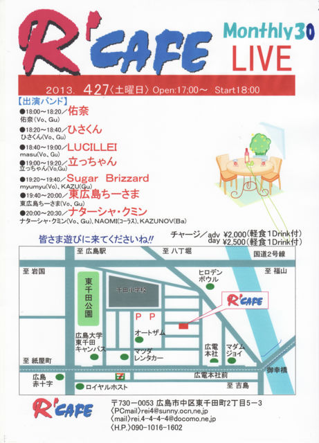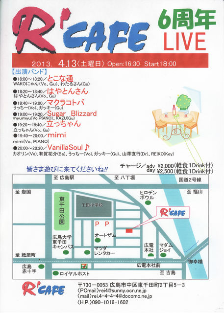 タイムメニューできました R'CAFE@広島 tel 090-1016-1602 広島県広島市中区 東千田町2-5-3 http://blog.goo.ne.jp/r_cafe/ OPEN 18:00start 18:30 charge adv\2.000(軽食・1Drink付) day\2.500(軽食1Drink付) チケットご予約 パソコンrei4@sunny.ocn.ne.jp phone torei.4-4-4-4@docomo.ne.jp 次回はR'CAFE Monthly LIVE 4月27日(土曜日) R'CAFE Monthly LIVE は5月18日 土曜日 九州よりゲスト 『うたうたいや正野』