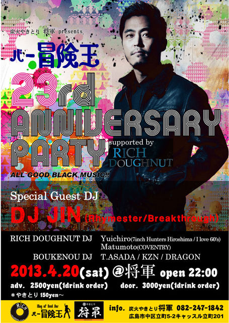 【バー冒険王23周年パーティー】 Special Guest DJ : DJ JIN(Rhymester) 日時 : 4月20日(土) 22時〜 場所 : 炭火やきとり 将軍 082-247-1842 料金 : 前売2500円(1drink order) 当日3000円(1drink order) やきとり 150円〜 音楽 : ALL GOOD BLACK MUSIC!! RICH DOUGHNUT DJ : Yuichiro(7inch Hunters Hiroshima/I Love 60's) / Matsumoto(COVENTRY) BOUKENOU DJ : T.ASADA / KZN / DRAGON 将軍の方に買いに来れない方はメッセージでも前売チケット予約を受け付けておりますので気軽にメッセよろしくお願いし